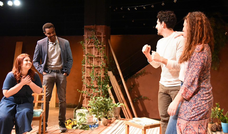 Canyon is a six-character play consisting of happily married Jake (Adam Shapiro) and Beth (Christine Woods)—he’s a househusband making improvements on their newly purchased home in a scenic canyon who wants “to fix the world,” she is a one-eighth Cherokee physician at County Hospital, and they’re expecting their first child. His African-American college buddy Will (Brandon Scott), a poorly compensated public defender in New York City, comes for a Labor Day 2016 weekend getaway with his wife Dahlia (Stefanie Black), who is primarily devoted to caring for their two young children, one of who has just been diagnosed as autistic; and the father and son team of undocumented Mexican handyman Eduardo (Geoffrey Rivas), who drinks a little too much to, as he says, stop thinking about his pain-in-the-neck wife, and Rodrigo, who plans to major in political science in college.