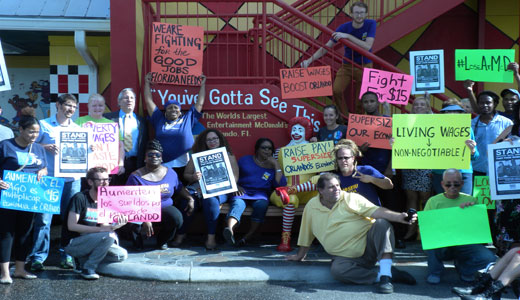 ORLANDO, Fla. – Chants of “You can’t survive / Off of $7.79” [Florida’s minimum wage] echoed from the sidewalk in front of the “world’s largest” McDonald’s in Orlando’s tourist corridor as local progressive forces held a demonstration here Dec. 5 to highlight the fact that fast-food workers earn some of our economy’s smallest wages.