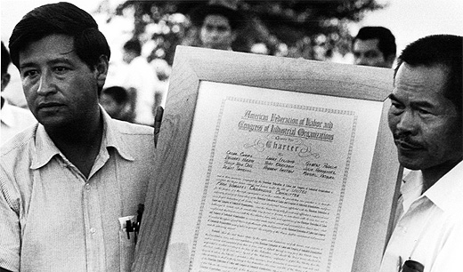 Photo: Cesar Chavez and Larry Itliong (of the Filipino Agricultural Workers Organizing Committee) holding the AFL-CIO charter for the United Farm Workers in 1971.