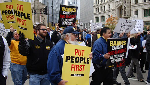 Dennis Gannon, president of the Chicago Federation of Labor, on Monday called for a stock transaction tax to make the big banks pay to create good jobs now. At a press conference in front of the offices of Goldman Sachs he announced that a coalition of labor, community and faith based organizations would me marching on Chicago’s LaSalle Street financial district Wednesday, April 28th, to demand that they help pay to clean up the mess they created and put people back to work. The Chicago march is one of a number of demonstrations around the country targeting Wall Street and the big banks. Richard Trumka, president of the AFL-CIO will lead one on Thursday on Wall Street in New York City.