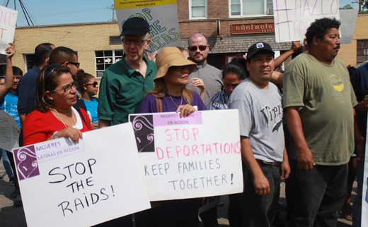 CHICAGO — Activists, community residents and laborers gathered on the corner of Milwaukee and Belmont in the heavily Latino neighborhood of West Avondale August 9 to denounce the recent increase in ICE raids taking place on the north west side of the city. Government agents had raided a neighborhood location where immigrant workers gather on Friday August 5 at around noon, forcing a group of laborers to to submit to illegal searches and mobile fingerprint scanners.