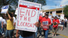 Photo: Demetrius Jackson, center with mic, and others, demonstrating at Rauner headquarters in Chicago. UNITE HERE Local 1 Facebook page