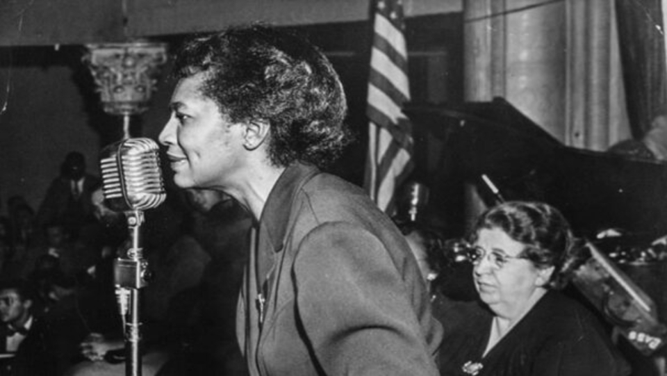 In 1945, Jones was appointed “Negro Affairs” editor of the Daily Worker as the paper’s youngest staff person. That same year, she helped found and was assigned to the National Negro Commission of the Communist Party by the party’s National Committee. She worked closely with organizations such as the New Jersey Labor School, taught symposia at the Jefferson School for Social Research, and worked with inter-faith groups on the issue of civil rights and racial equality. In 1946, Jones helped organize a mass demonstration in Albany, N.Y., to protest the slaying of two Black youths in Freeport, Long Island in New York.