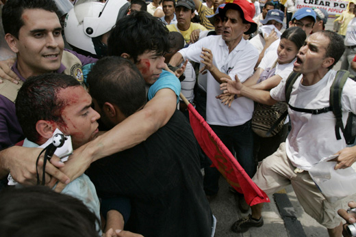 Photo: Demonstrators bleed and shout after being attacked by police at the Labor Day march in Cali, Colombia, May 1, 2010. Christian Escobar Mora/AP