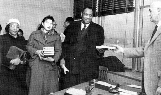 Photo from the CPUSA archives, courtesy Tamiment Library: December 17, 1951 – Paul Robeson and the Civil Rights Congress present WE CHARGE GENOCIDE with William Patterson, a petition charging the United States with genocide against Black Americans, to UN Secretariat in New York.