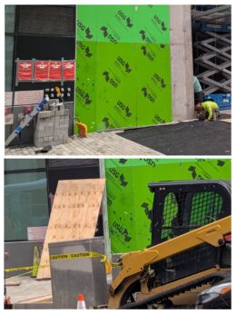 Below: A piece of plywood obstructs the stop-work orders from view at 9:03 am on 8/14/25 after the man who dragged it there told a reporter they were being “fucking nosy” for trying to take pictures of the postings.| Cameron Orr/ People’s World
