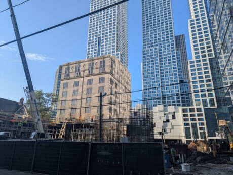 Behind the center Journal Squared tower, a new AJD Construction and Panepinto Properties project can be partially seen, which broke ground in 2023. The laborers’ work being done there is non-union.| Cameron Orr/People’s World