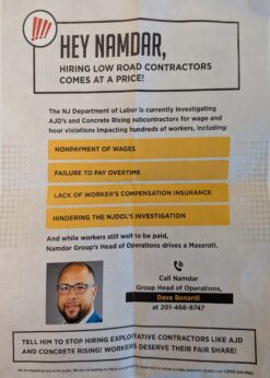 Workers at The Journal had informed LIUNA Eastern Region organizers that they worked for weeks without pay on that AJD project last year. The union worked with more than 70 workers at that time to help them file claims with the NJDOL. When personnel from the state’s labor department visited the site, company foremen and supervisors lied to the workers, saying the investigators were ICE agents. Many of those hired by the company were immigrants.
