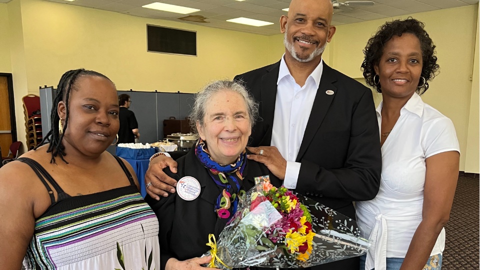 A standing ovation greeted Joelle as Kevin Lynch, founding president of CT ARA, presented the award, saying it was long overdue. He praised Fishman’s constant solidarity with workers’ struggles, handing out the People’s World at conventions, and rallying for social justice across the state with husband Art Perlo, who helped organize Local 34 at Yale 40 years ago and served on the executive board of Yale Unions Retirees Association (YURA).