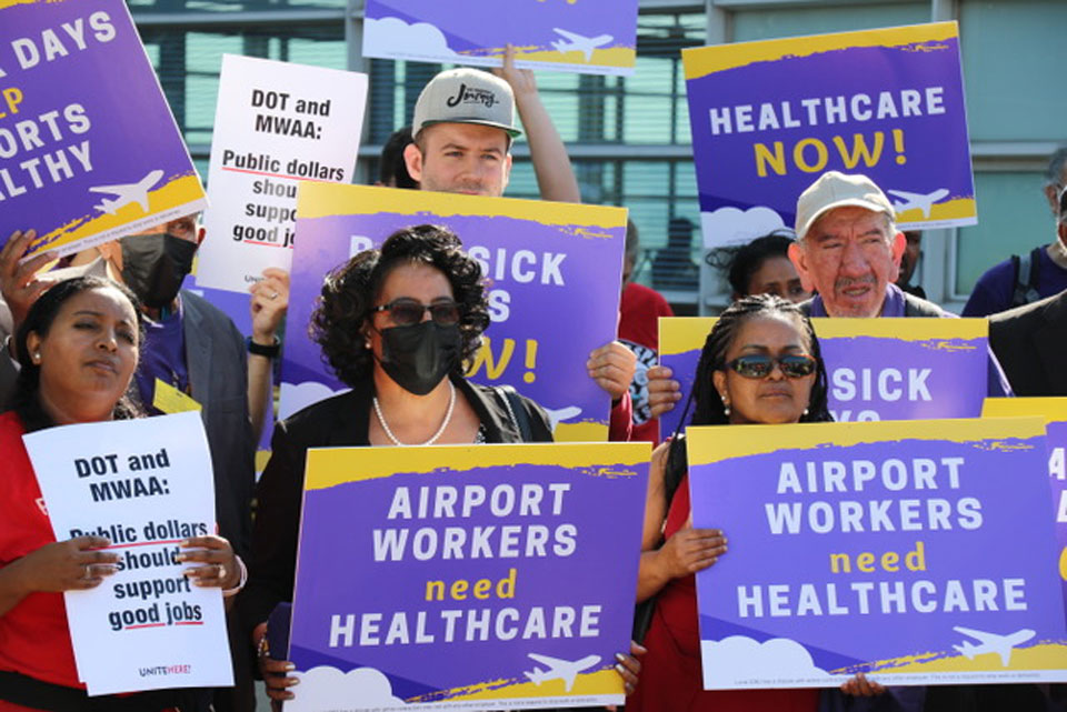 Lack of affordable health care coverage and the point penalties for getting sick brought dozens of workers for MWAA contractors, including members of Service Employees Local 32BJ—like Swartz—and Unite Here Locals 23 and 25 to National Airport September 21 for a pointed protest.