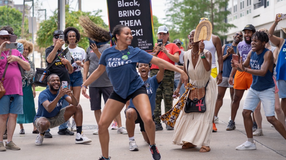 As a march got underway after the rally, people started dancing to the beat of a drum—line dancing, the electric slide, and more. The fired dancers joyously started doing impromptu dance solos.