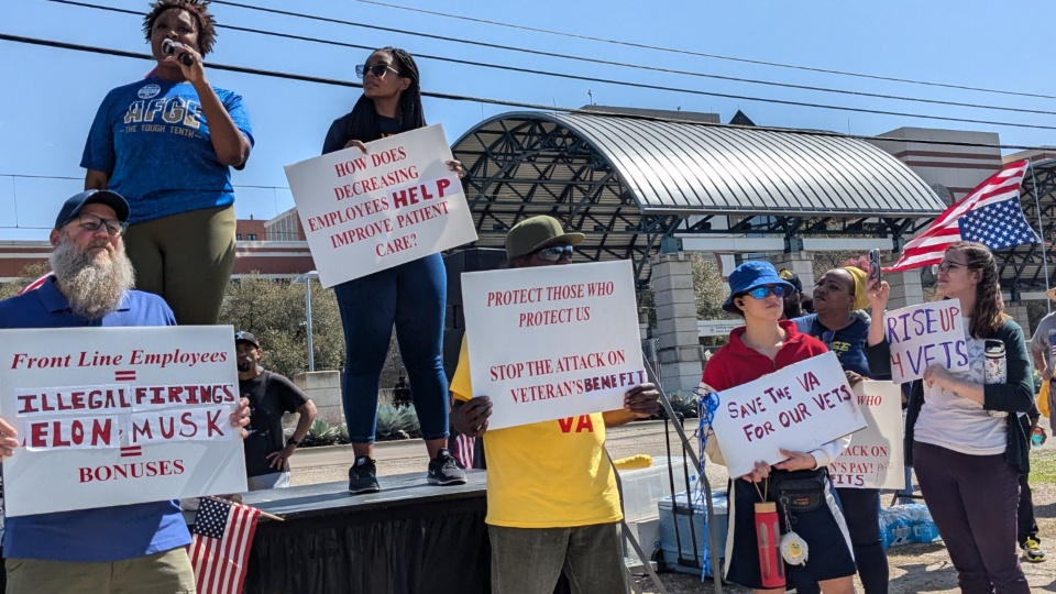 DALLAS—About 300 enthusiastic North Texans, most of them military veterans rallied at the Veteran Affairs (VA) Hospital on Lancaster Road in Southern Dallas on March 14 to say no to Elon Musk’s firing of 2,400 VA employees, including 14 in North Texas.
