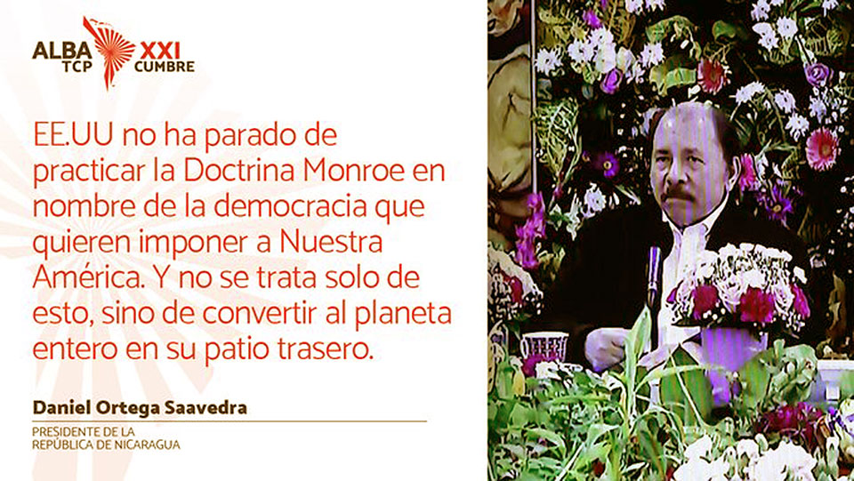 A través de un mensaje grabado, el presidente de Nicaragua, Daniel Ortega, participó junto a otros líderes del continente en la XXI Cumbre de Jefes de Estado y de Gobierno de la Alianza Bolivariana para los Pueblos de Nuestra América-Tratado de Comercio de los Pueblos (ALBA-TCP).