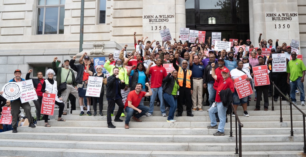 The rally in front of the John Wilson Building, D.C.’s city hall, drew a mixture of Amalgamated Transit Union Local 689 members and Circulator riders, plus a retired Steelworker active in community organizing. The local represents the system’s 178 drivers, plus its mechanics and other workers.