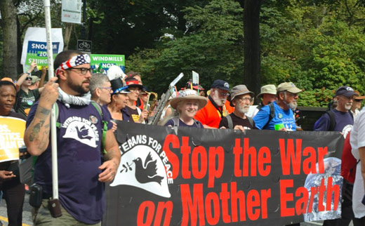 Photo: Veterans lead the “We Know Who Is Responsible/Peace and Justice” contingent of the Climate March in New York City. Veterans for Peace members carried the “Stop the War on Mother Earth” banner and the inflatable bomb. Earchiel Johnson/PW.