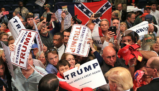 Photo: Donald Trump works the crowd during a campaign rally in Macon, Georgia on November 30, 2015 as a Confederate flag is unfurled by a supporter. | Curtis Compton / AP