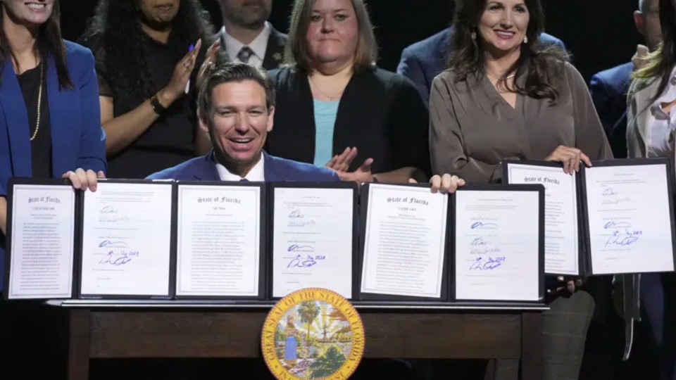 DeSantis has made anti-LGBTQ legislation a large part of his agenda as he prepares to seek the Republican presidential nomination. He signed the bills in front of a cheering crowd at the evangelical Cambridge Christian School in Tampa. The ceremony had a campaign-like feel, with DeSantis tossing Sharpies to a crowd, as opposed to when he privately signed measures on abortion and gun rights.