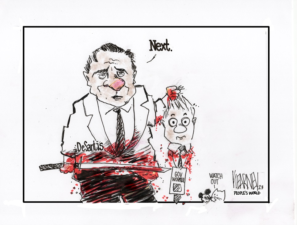 If he wins the White house, Florida Gov. Ron DeSantis promised mass murder of “bureaucrats,” a favorite Republican denigration of government workers—local, state, and federal. “We are going to start slitting throats on Day One” of the federal employees, he stated.Read the full story: DeSantis in N.H. calls for slitting the throats of federal workers