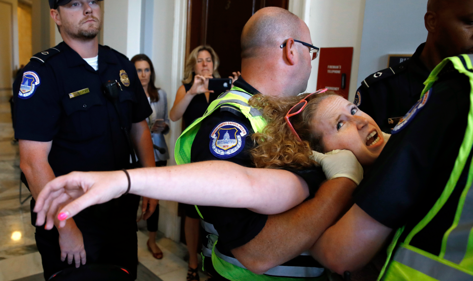 Some 60 disability rights activists from ADAPT were dragged out during a similar demonstration at Senate Majority Leader, Mitch McConnell’s office. McConnell, who has been a leading voice in the battle to dismantle Obamacare, had Capitol Hill Police forcibly remove protesters in wheelchairs during the staged “die-in.”