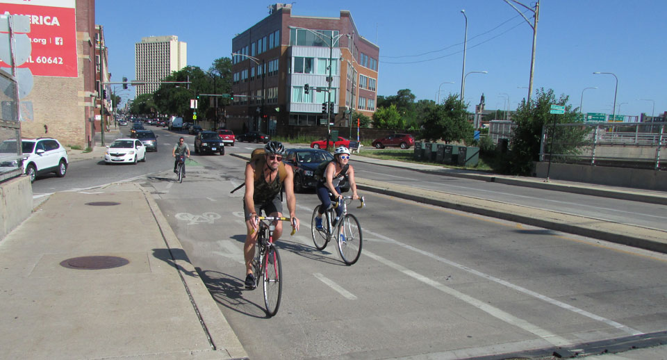 My favorite stretch of the ride is along Milwaukee Avenue. There are a lot more cyclists, for one thing, so you tend to feel secure in numbers. In places, the city has constructed barriers and painted the bike lane green. At one point there are two lanes, one for passing. I feel much safer there.