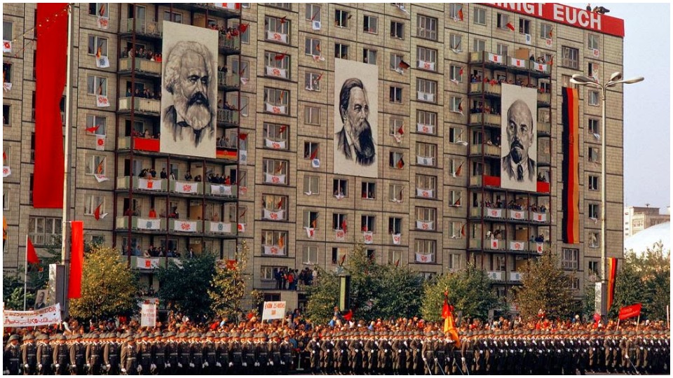Apartments along Berlin's Karl Marx Allee decked out with portraits of Marx, Engels, and Lenin for a May Day parade in 1974. | Thomas Hoepker / German Federal Archive