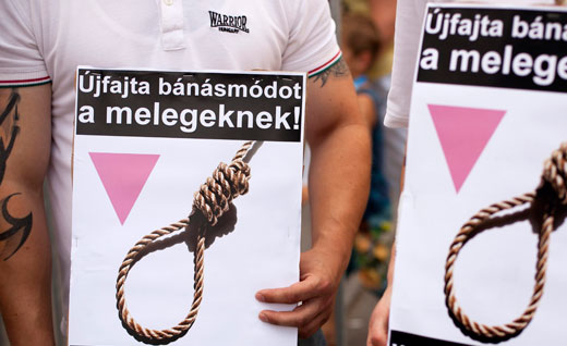 Photo: Fascist anti-gay protesters hold signs reading “New treatment for homosexuals!” showing a noose and pink triangle, at the gay rights march in downtown Budapest, Hungary, June 18. The pink triangle was one of the Nazi concentration camp badges, used to identify male prisoners who were sent there because of their homosexuality (Balazs Mohai/AP)