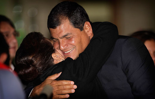 Photo: Ecuador President Rafael Correa is embraced by his mother, Norma Delgado, as they celebrate his election victory. Dolores Ochoa/AP