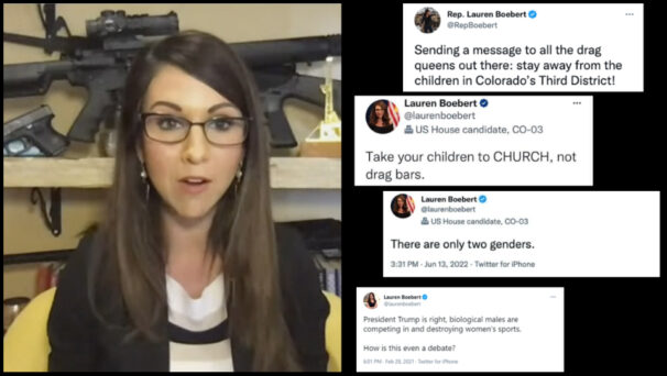 Boebert dice que las personas LGBTQ están “pervirtiendo” a Estados Unidos y que a ningún niño se le debe permitir salir del armario hasta que tenga 21 años. Cuando las escuelas ofrecen currículos que incluyen a LGBTQ, lo llama un caso de “la izquierda acicalando a nuestros niños” sexualmente. “Lleve a sus hijos a la IGLESIA, no a las barras de arrastre”, tuiteó.