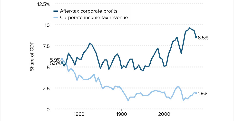 - In 1952, corporate profits were 5.5 percent of the economy, and corporate taxes were 5.9 percent of gross domestic product. Today, corporate profits are 8.5 percent of the economy, and corporate taxes are 1.9 percent of GDP. Corporations used to contribute $1 out of every $3 in federal revenue. Today, they contribute $1 out of every $9.