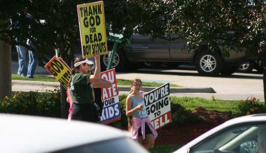 The Westboro Baptist Church, led by its pastor Fred Phelps, has protested at military funerals, funerals of victims of gay-bashing, concerts and countless other events, for years. By their own count, they have participated in over 30,000 pickets. They say that God hates America for its tolerance of the lesbian-gay-bisexual-transgender (LGBT) community and that dead soldiers, terrorist attacks and natural disasters – among a myriad of other tragedies – are divine retribution for this tolerance. These protests often include signs such as “God hates fags,” and “Thank God for dead soldiers,” as well as flag desecration.