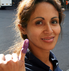 At the front of the line and showing great enthusiasm — though they had already been standing for many hours — were a group of young women. As we talked, a large convoy of cars and pick-up trucks went by with people clapping and singing for Chavez. The voters responded with their own set of cheers.
