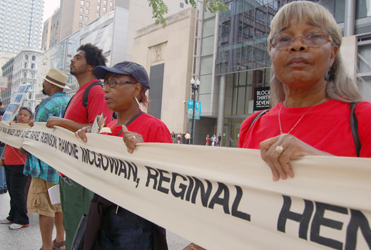Families marched with large pictures of their loved ones held aloft. A rally at Daley Plaza was ringed by a long banner bearing the names of hundreds of victims of the Sgt. Jon Burge torture scandal. Burge was a Chicago Police Department (CPD) commander who oversaw a torture chamber that extracted false confessions from hundreds of victims over decades, many who ended up on death row.