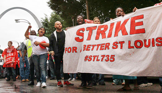 Photo: An August 27 demonstration by fast food workers takes place in St. Louis. It is one of many that took place in 58 cities across the nation. Derik Holtmann/AP