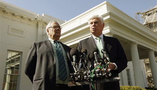 Photo: Senate Banking Committee Chairman Sen. Christopher Dodd, D-Conn., right, accompanied by House Financial Services Committee Chairman Rep. Barney Frank, D-Mass., talks to reporters outside the White House March 24, 2010, after meeting with President Obama to discuss financial reform. Charles Dharapak/AP