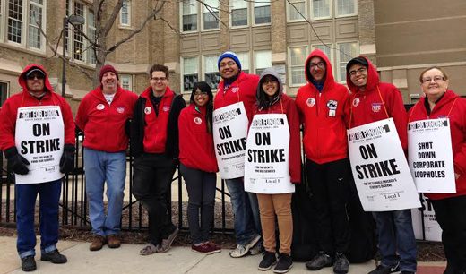 CHICAGO – It was their first strike. They stuck together on the picket line. They wore their union’s color – red – and had “On Strike” signs hanging from their necks. A half-dozen first- and second- year teachers at Marsh Elementary got a taste of solidarity April 1, when some 27,000 Chicago Teachers Union members walked out to demand the state pass a budget and fund education.