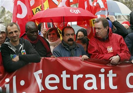 Photo: CGT trade union leader Philippe Martinez, center, attends a demonstration against proposed changes to France’s work week and layoff practices, in Paris, Saturday, April 9, 2016. Protesters across France are marching to voice their anger at labor reforms being championed by the country’s Socialist government. | Christophe Ena/AP