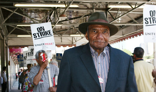 Photo: Frank Lumpkin on HERE picketline at The Congress Plaza Hotel with hotel workers in Chicago, July 2, 2005. Jose Cruz/PW