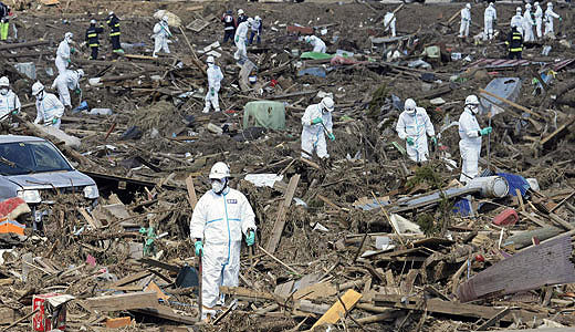 Photo: Tokyo police wear special suits to protect them from radiation as they search for victims during the tsunami in 2011. Takuya Yoshino/AP