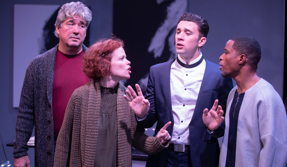 So middle-aged writer Daniel Totten’s (Darrett Sanders) wife, Alice (classically handsome Billy Flynn, who acted in NBC’s soap Days of Our Lives) chooses to be reborn as a male. However, although the Caucasian husband and born-again wife are now the same gender, they both consider themselves to be heterosexual. (Although the Tottens’ daughter, Dee—played with angsty panache by Ann Noble, who has a Michelle Wolf-ish vibe—actually is gay.) This LGBTQ conundrum is amplified when Daniel’s best buddy Phillip Fain (Claire Blackwelder, who looks like a younger, more voluptuous Keri Russell) shows up as a busty woman. Phillip is literally a straight male inside of a female’s body. So enthralled is he by his new womanly attributes that Phil can’t help but caress himself on- and offstage and, although now wearing a dress, still sits with habitual man spread. With all of this out-of-kilter gender role-playing, complications ensue.