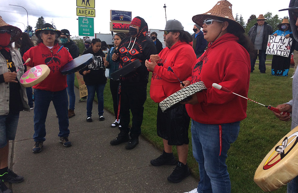 The latest here was a vigil and “die-in” in the town of Forks in the West End of Clallam County, the “Logging Capital of the World,” although the forest industry is much diminished from its glory days a century ago. Nearly 300 people, about half members of the Hoh, Quileute, Makah, and Lower Elwha tribes, chanted, “I can’t breathe,” “No justice, no peace,” and “Black Lives Matter,” as a stream of cars and trucks rolled through the downtown on U.S. Highway 101 with horns honking. Drivers and passengers greeted the protesters with thumbs-up salutes. Drummers pounded on their drums and sang a tribal song, while teenage girls performed a Native American dance. At least half the crowd were young people—Native American Indian and white.