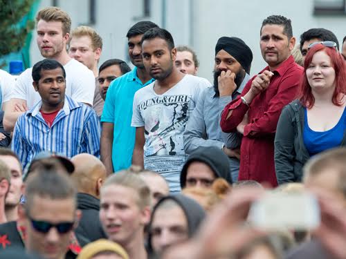 Photo: Left-wing demonstrators stand with refugees in front of building accommodating immigrants in Freital near Dresden, Germany, June 26. Across from them members of Pegida, the right-wing movement that staged regular rallies in Dresden and elsewhere against immigrants and Muslims, initiate protests and demonstrate against the arrival of refugee families. | Jens Meyer/AP