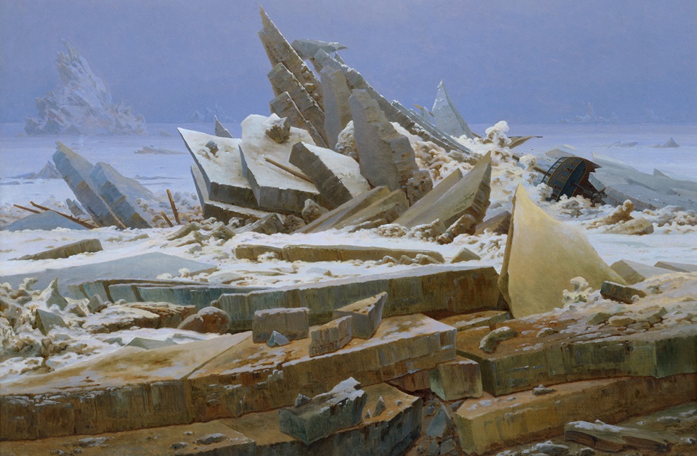 Friedrich’s painting Eismeer (The Sea of Ice) (1823-24, oil, Hamburger Kunsthalle), also referred to as The Wreck of Hope) was created during this time of Restoration. The initial impression on this 38×50 in. canvas is dominated by a highly dramatic scene: huge, sharp-edged ice floes rising at pyramidal angles dominate the center of the image, conveying a sense of mortal threat. The horizontal lines of the ice layers and the vertical breaks and peaks of the ice blocks create a dynamic element that heightens the drama of the scene.