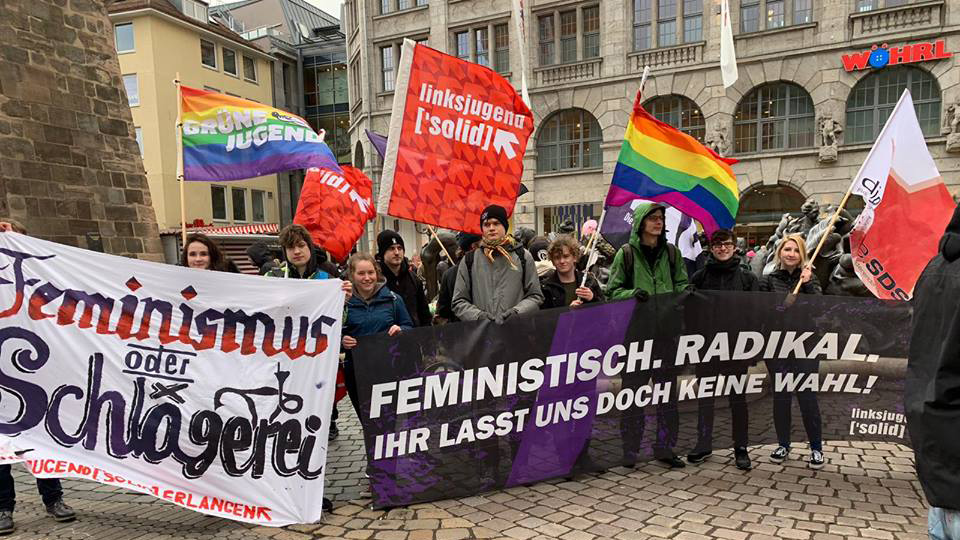 What a surprise! The wide square was jammed with thousands and thousands, mostly young women, maybe 20 percent young males, and only a light seasoning of grayheads and graybeards. During an hour’s wait before marching off with sound trucks and big banners, I squeezed through the crowd, hunting for a familiar face. I finally found another old-timer, a refugee from Pinochet’s Chile who settled here. Always active, she was currently busy fighting right-wing attempts to seize Berlin’s Venezuelan Embassy. But she took part today, and we were glad to meet.