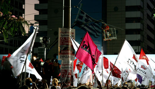 Photo: Greeks wave banners of the left-wing SYRIZA party, June 14 in Athens. bluto blutarski // CC 2.0