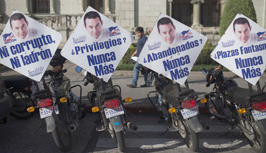 Motorcycles with signs in support of Jimmy Morales at a campaign rally in Guatemala City, Oct. 22. The signs read in Spanish “Privileges? Never again.” AP Photo/Luis Soto