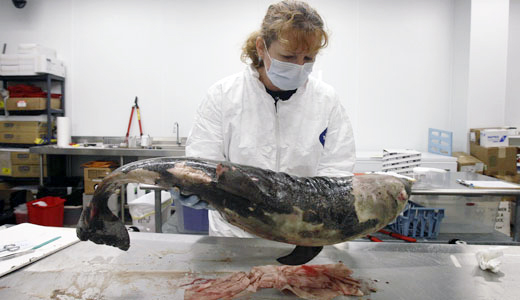 Photo: A veterinary technician handles a dead bottlenose dolphin, one of many collected along the Gulf of Mexico. Patrick Semansky/AP