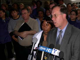 “We are quite pleased with the progress and are optimistic,’ said Workers United Midwest Treasurer Joe Costigan before a crowd of HartMarx workers and their supporters. Workers United represents the workers at their production facilities in Des Plaines and Rock Island, Ill., and Rochester, N.Y.