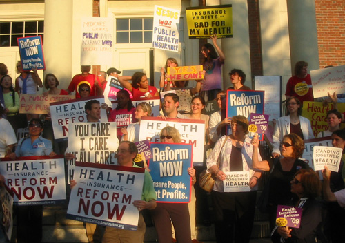 Health care supporters far outnumbered an all-white group of about 150 opponents, who carried signs attacking Obama, expressed opposition to “government run” programs while ironically demanding “hands off Medicare,” and in some cases shouted racist insults at health care supporters.