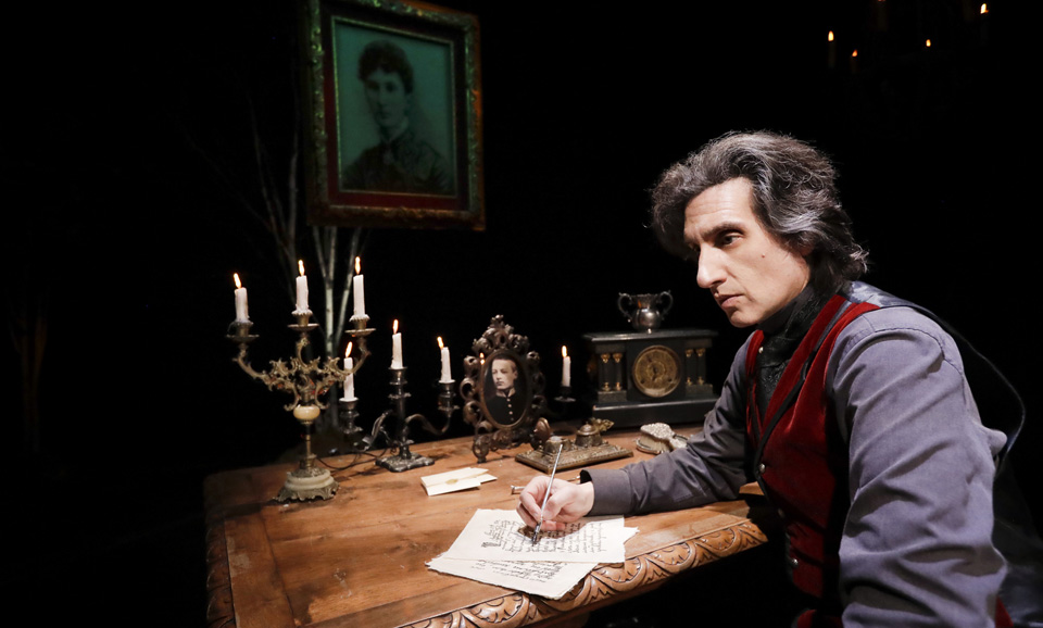 The show is set on a single platform outfitted with a Steinway piano as its centerpiece, and other items of furniture and décor suggesting the comfortable life of a successful 19th-century Russian cultural titan. On-stage trees place the room in Tchaikovsky’s dacha, and projections take us not only through the seasons and their moody skies, but also through the salons of high society and the concert halls of world fame. This is one of the most effective applications of projection technology that I have seen in the theatre. Felder himself designed the set.