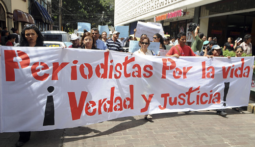 Photo: A protest against on the attacks on journalists in Tegucigalpa, Honduras. International human rights monitors are investigating. The banner reads in Spanish “Journalists for life, truth and justice.” (Fernando Antonio/AP)